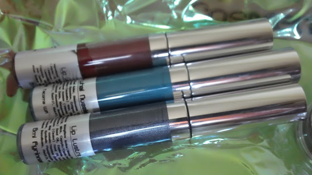 The three lip lustres I got from top to bottom are: Sweetest Poison - true shimmery red, Narwhal Nuzzles - vibrant shimmery turquoise, and Pierced - deep sparkly pewter. These are creamy, non-sticky, smooth, satiny, color saturated, and dry to a semi-matte finish. They last really long and very comfortable on the lips. They all smell like cake:D